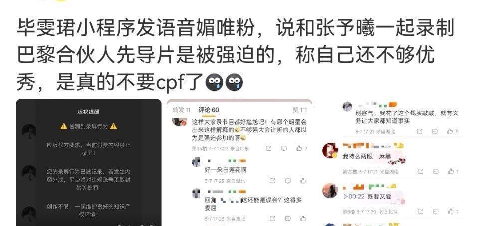 粉丝阵营对立。CP粉认为语音背叛了《深情眼》时期的“他超爱”形象,尤其二人综艺互动曾以自然默契著称(如张予曦意外坐毕雯珺腿、挽袖子等细节),如今“被迫营业”论打破幻想。