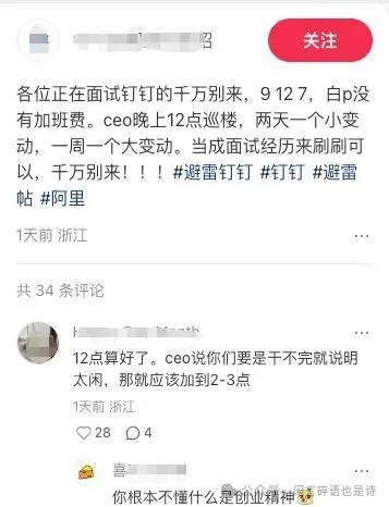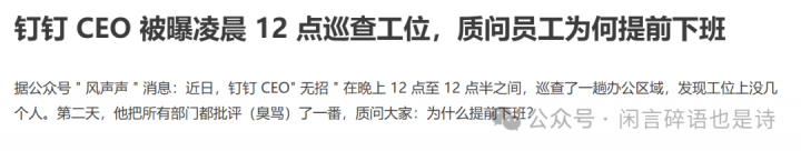 据说当晚是凌晨十二点多,钉钉CEO无招路过办公区,发现工位上空荡荡的,第二天在全员会上发飙,质问大家:“为什么提前下班?”有人说这是假新闻,也有人说是知情人爆料,总之真假各一半,我也没法打包票。